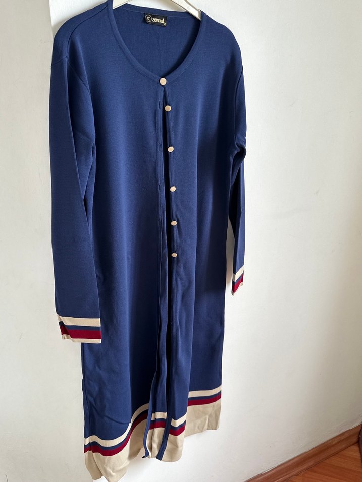 Düğmeli ve uzun kollu, notched lapel yakalı mavi triko elbise. Rahat kesimiyle günlük sokak stiline uygundur.rahat triko zümral