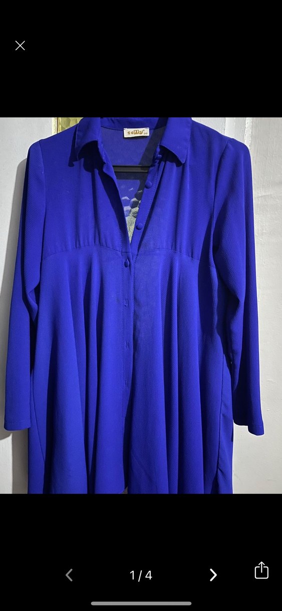 Mavi, düğmeli, V yaka uzun kollu tunik. Rahat kesimi ve sentetik kumaşıyla günlük sokak stiline uygun.