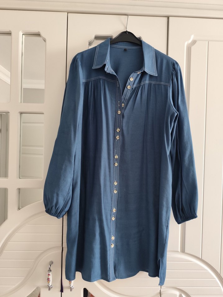 Bol kesim, yakalı ve uzun kollu tunik. Düğmeli önü ve parlak mavi rengiyle yumuşak denim kumaştan üretilmiştir, günlük kullanım için uygundur. 38 40 beden uyumlu