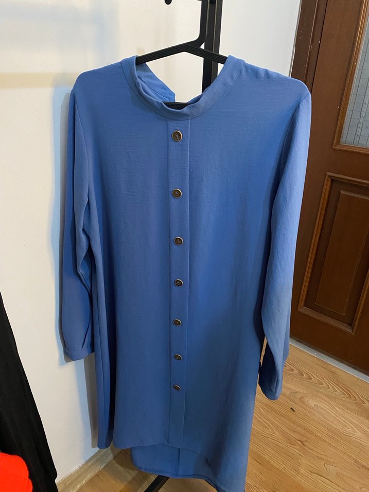 Düğmeli ön cepheli, yakalı, uzun kollu mavi tunik. Rahat kesimli, parlak ve ipeksi kumaştan, ofis için uygun.