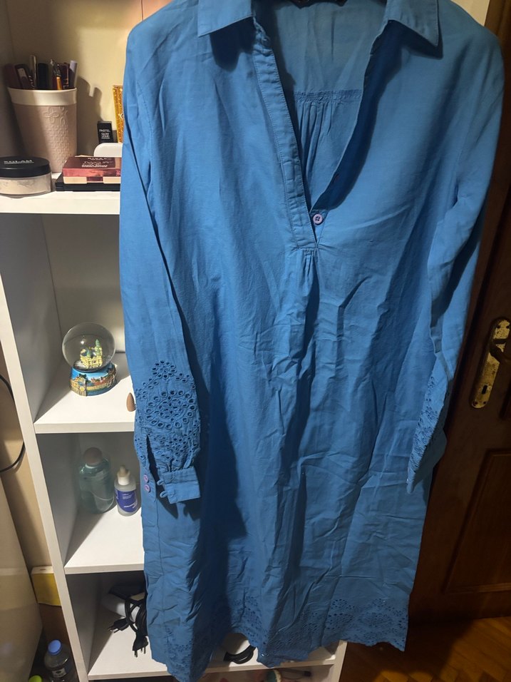 Bol kesim, uzun kollu mavi tunik, düğmeli ve yakalıdır. Rahat keten kumaştan yapılmış, günlük kullanıma uygun bohem tarzda.