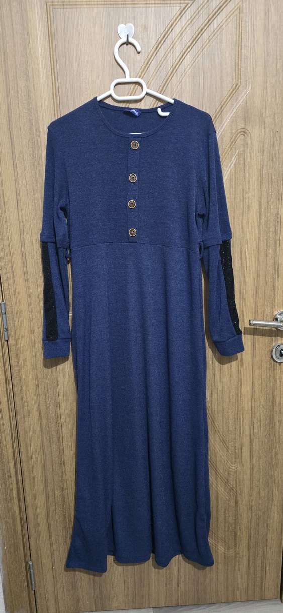Düğmeli ve uzun kollu, bol kesim bu elbise yumuşak yün kumaştan yapılmıştır. Mavi renkte, rahat ve sade tasarımıyla günlük kullanıma uygundur.