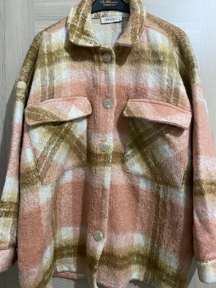 Düğmeli, uzun kollu, kısa mini kesim kadın gömlek. Bej tonlarında pastel tie-dye deseni ve ön kapaklı cepler bulunur. Yumuşak ve sıcak kumaştan üretilmiştir.