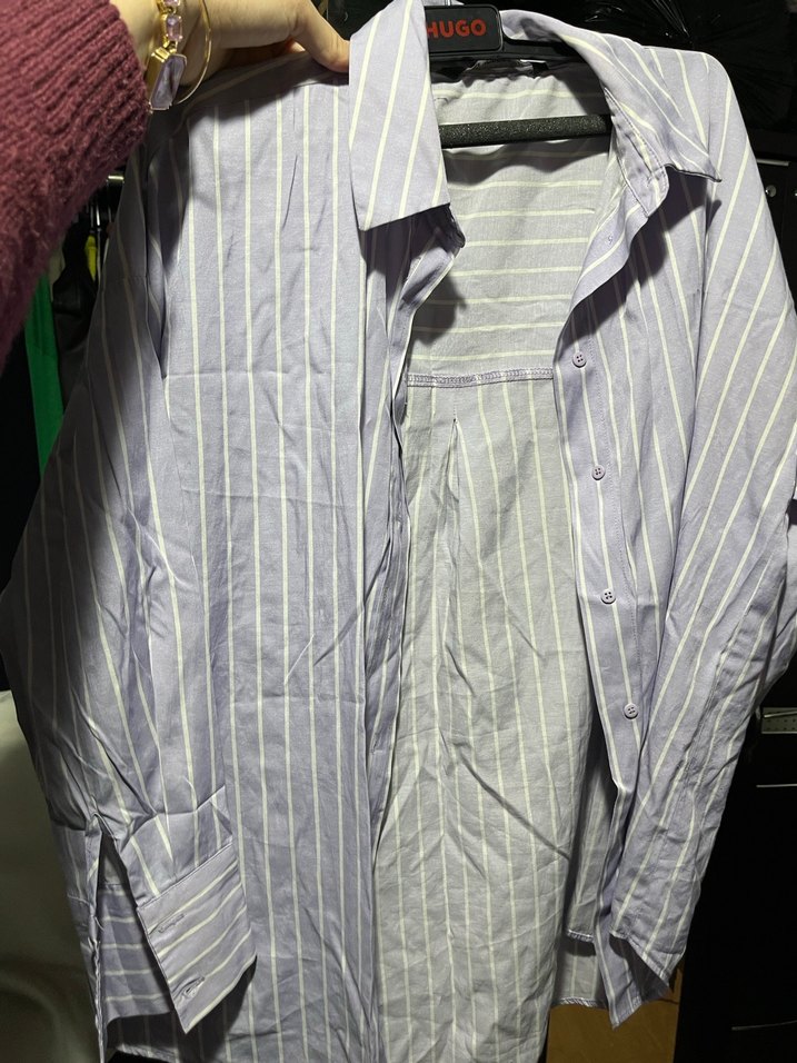 Pamuk kumaştan, uzun kollu, düğmeli ve yakalı, bol kesim mor ve gri çizgili kadın gömleği. Günlük rahat stil için uygundur.