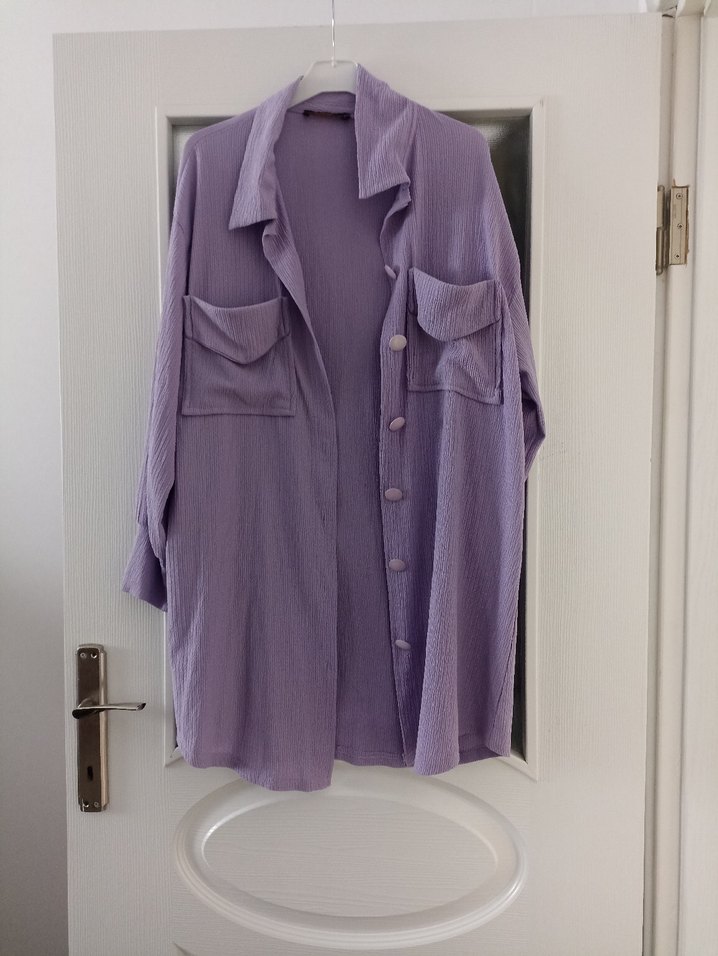 Pastel mor renkli keten gömlek, uzun kollu ve düğmeli. Salaş kesim, yakalı ve iki ön cep detaylı, günlük rahat kullanım için uygun.