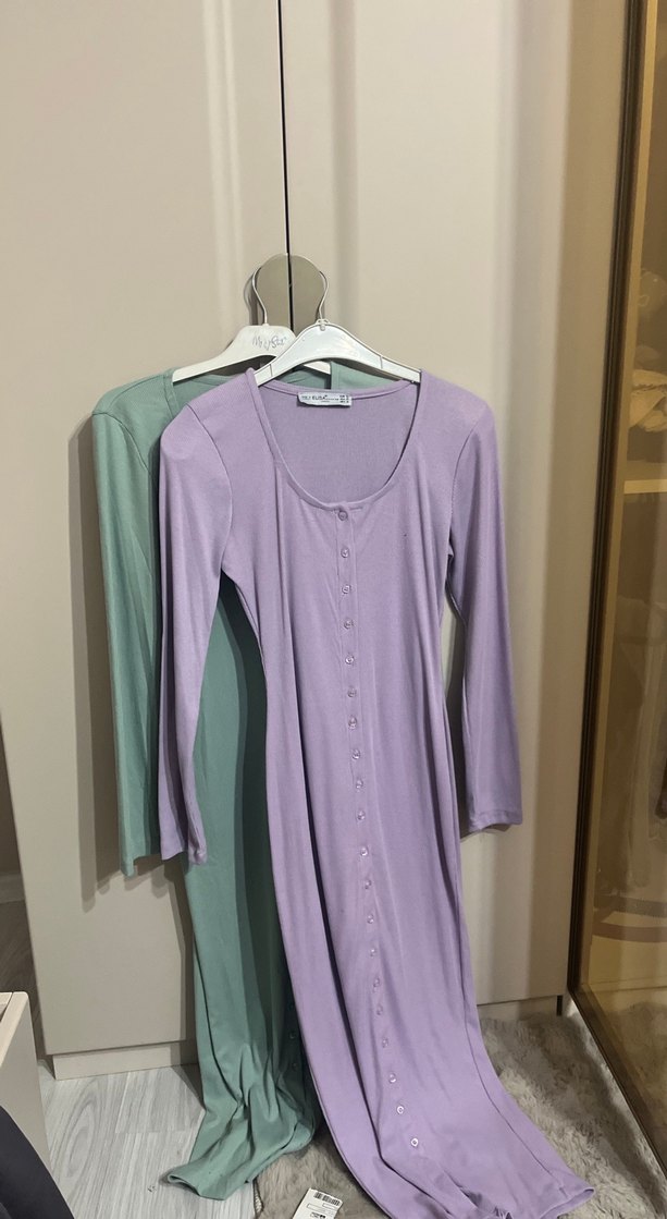 Düğmeli Uzun Kollu Mor Pamuklu Elbise
