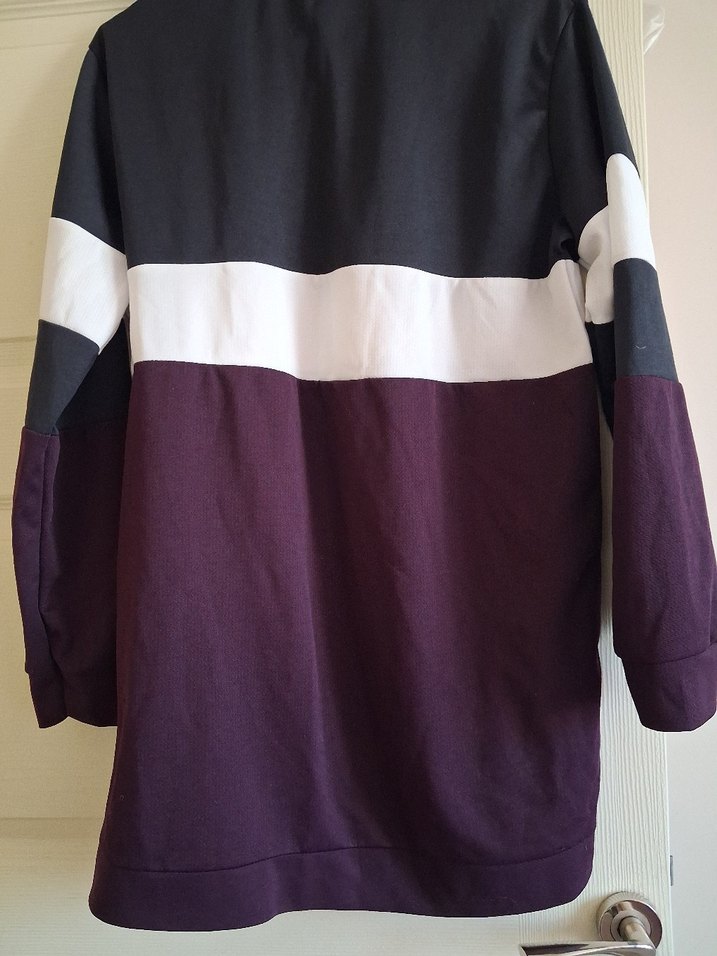 Kadınlar için uzun kollu, bol kesim, düğmeli ve bisiklet yaka sweatshirt. Koyu mor, siyah ve beyaz renk bloklu, sentetik kumaştan üretilmiştir. Rahat sokak stili için uygundur.