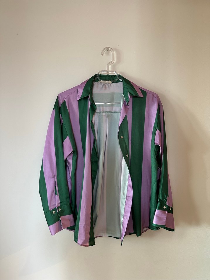 Düğmeli, uzun kollu, notched lapel yakalı kadın gömlek. Mor ve yeşil parlak çizgili, ipeksi kumaştan, rahat kesim. Günlük sokak stili için uygun.