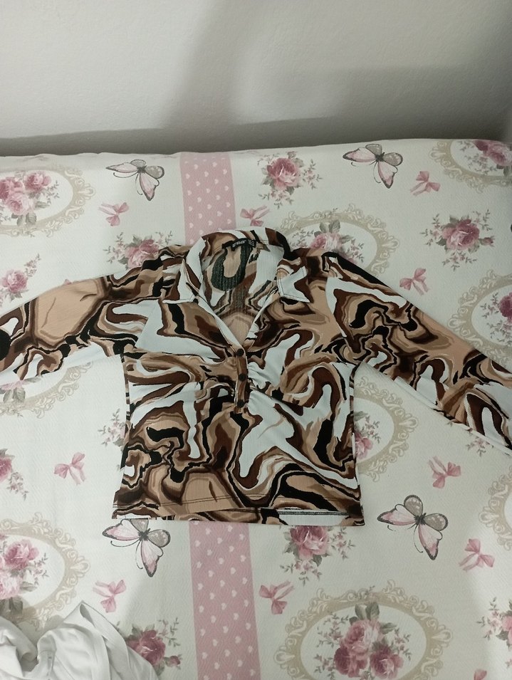Uzun kollu, yakalı ve düğmeli kadın bluz. Gevşek kesim, kısa boy ve pastel kahverengi bağlama desenli, günlük sokak stili için uygun, bohem tarzda.