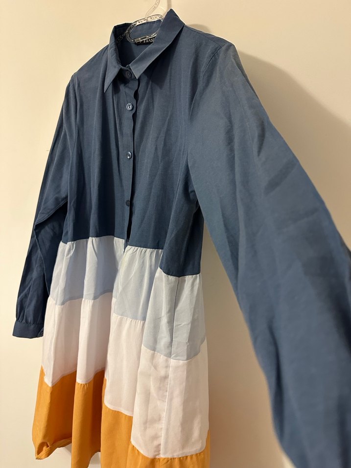 Pamuklu, düğmeli, yakalı ve uzun kollu bol kesim kadın gömleği. Gri, beyaz ve hardal renk bloklarıyla sokak stiline uygun.