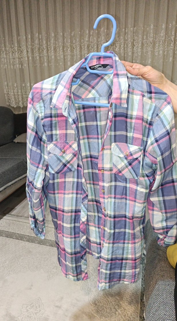 Pamuklu, düğmeli, uzun kollu, yakalı, bol kesim kadın gömleği. Pastel çok renkli, bağlama desenli, günlük rahat stil için uygundur.