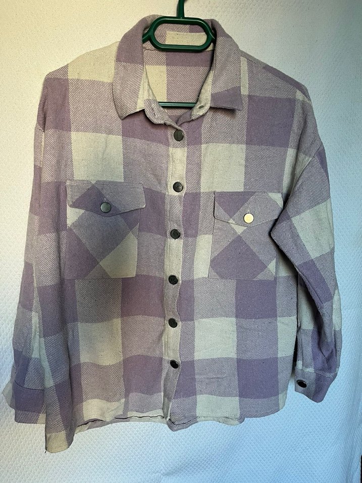 Bol kesim, uzun kollu, düğmeli pamuklu kadın gömleği. Mor ve gri kareli desenli, rahat sokak stili için uygundur.