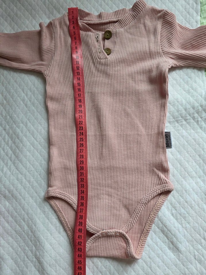 Pastel pembe renkte, düğmeli V yakalı ve uzun kollu bebek body. Desensiz ve yumuşak dokulu kumaşa sahiptir.