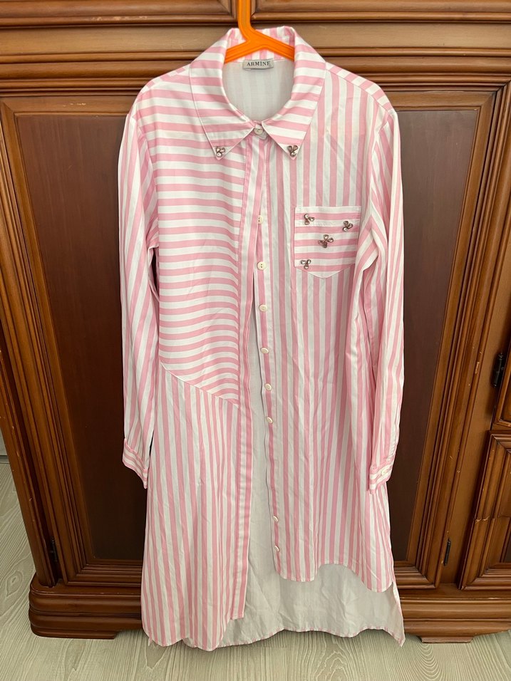 Hiç giyilmedi . Düğmeli, uzun kollu, pamuklu kumaştan yapılmış, pembe çizgili uzun kadın gömleği. Normal kesim ve notched lapel yakaya sahiptir.