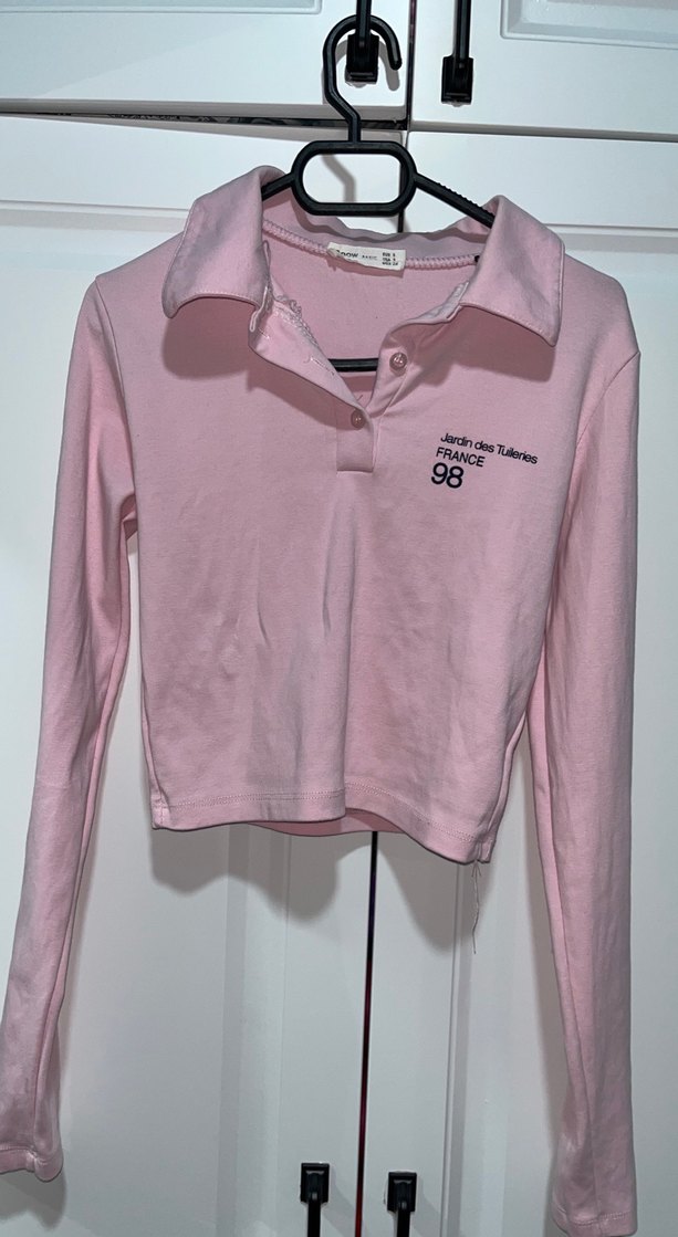 Düğmeli, yakalı, uzun kollu ve fitted kesimli pembe kadın gömleği. Yumuşak, sıcak kumaştan, baskılı detaylı ve '98' yazılı. Günlük sokak stili için uygun. 1 kez giyildi