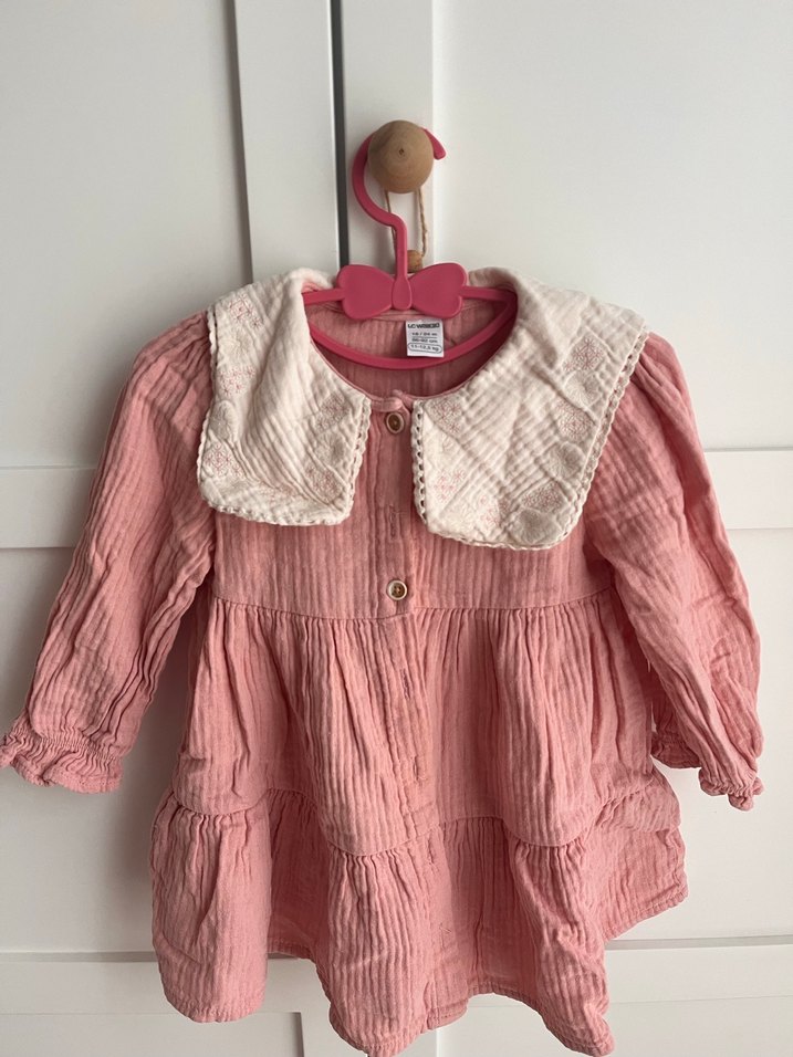 Bol kesim, uzun kollu, yakalı, düğmeli ve nakış detaylı pembe keten kız elbisesi, bohem tarzında.