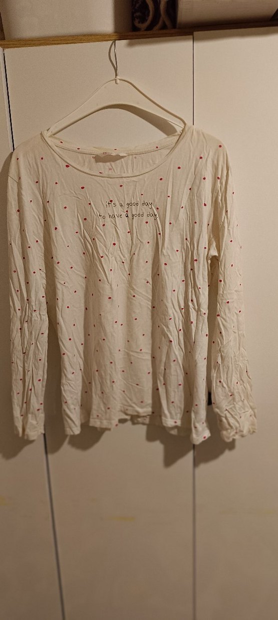Pamuklu, uzun kollu ve düğmeli tişörtü. Bol kesimli, beyaz renkli ve baskılı deseniyle günlük kullanıma uygun. pijama üstü 1 kere giyildi.