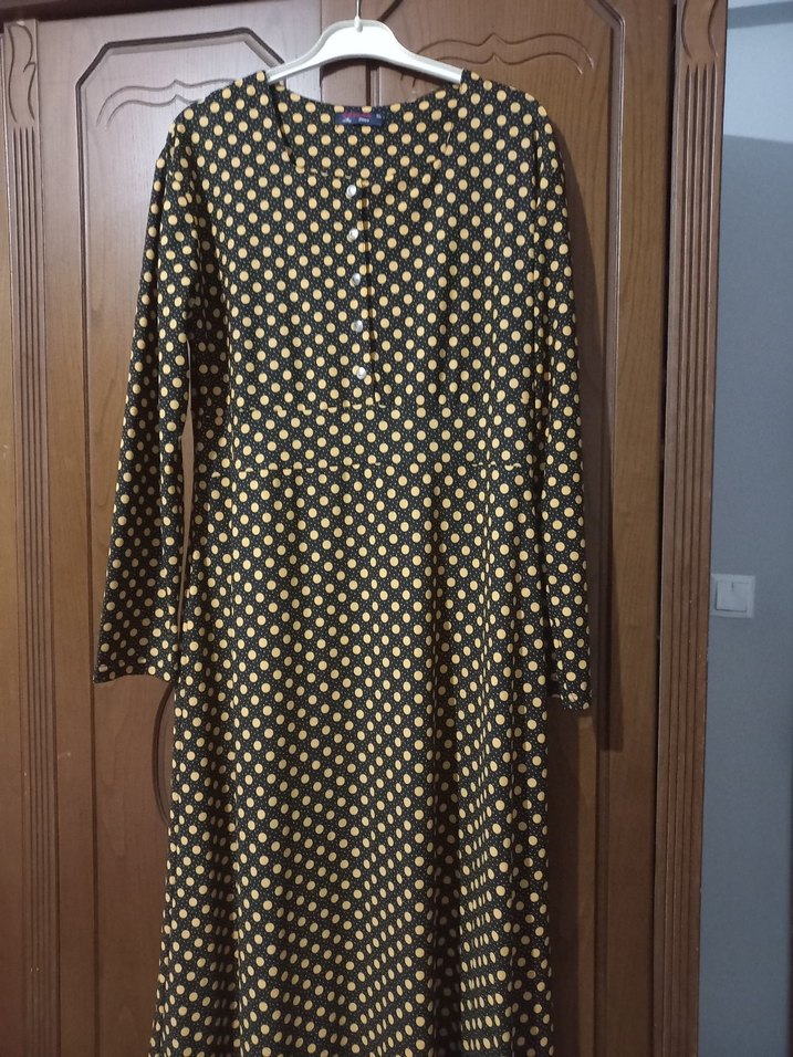 Düğmeli ön kısım, uzun kollu, bol kesim uzun elbise. Kahverengi puantiyeli yumuşak sentetik kumaştan, bohem tarzda, günlük kullanıma uygun. ölçüler resimlerde mevcut Alana şimdiden hayırlı olsun