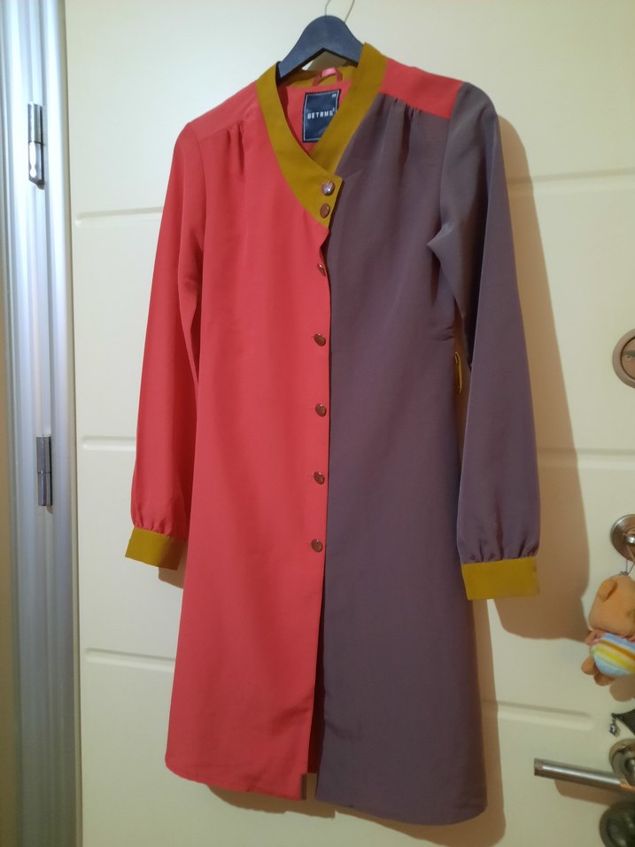Düğmeli, uzun kollu ve yakalı kadın tunik. Yumuşak sentetik kumaştan, çok renkli pastel tonlarda, ofis için uygun avant-garde tarzda. uzunluk 90 cm. iki koltuk arası 42 cm.