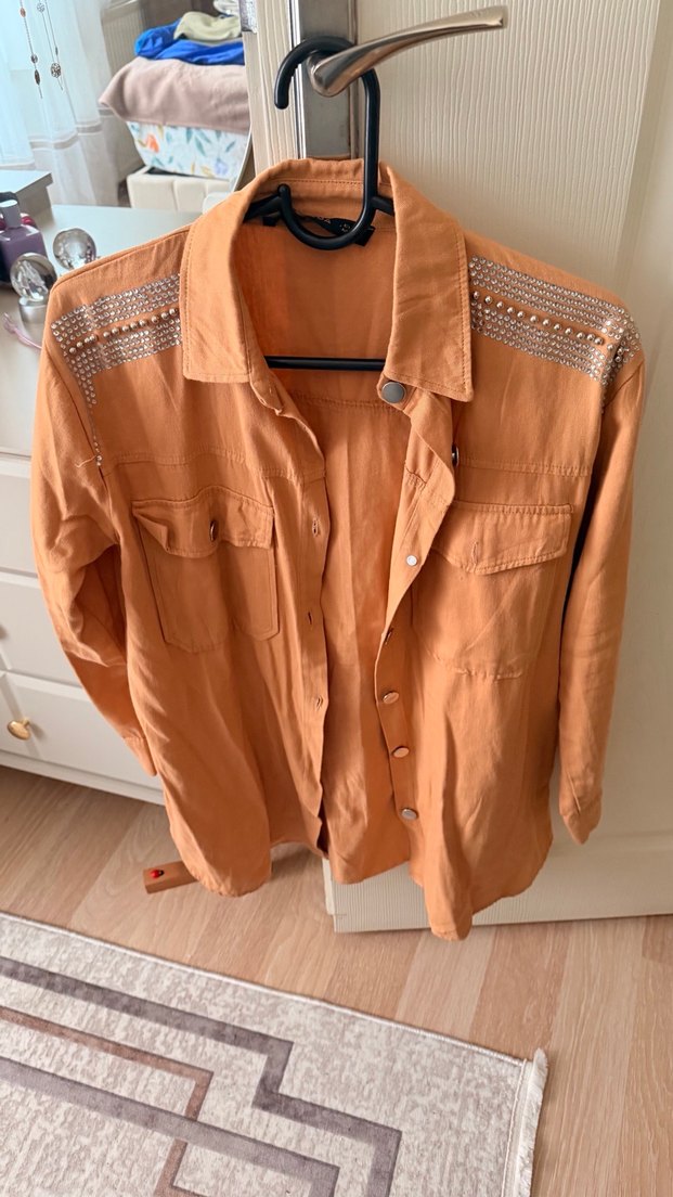 Bej renkte, yumuşak süet kumaştan yapılmış, uzun kollu, düğmeli ve salaş kesim kadın gömleği. Omuzlarda parlak süslemeler ve kesik yaka detayları bulunur. Günlük sokak stiline uygundur.