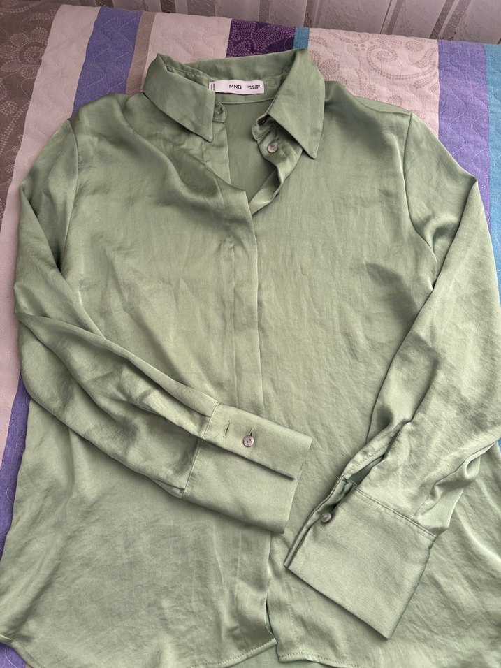 Düğmeli ön kısmı, yakalı ve uzun kollu saten kumaştan yapılmış bol kesim haki renk gömlek. Günlük kullanıma uygun normal uzunlukta.