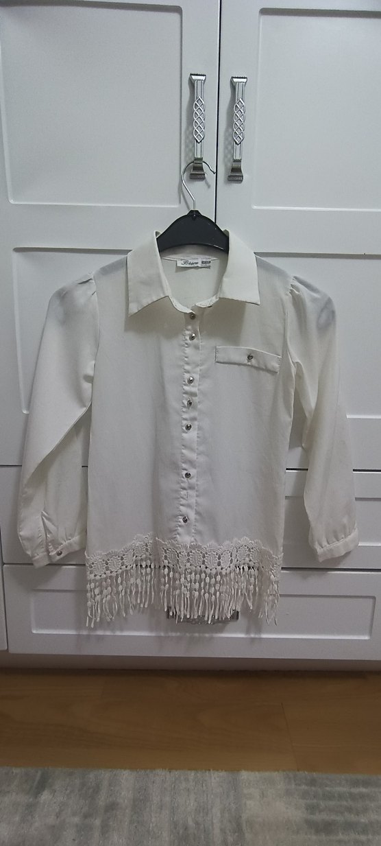 şifon kırık beyaz gömlek, uzun kollu ve yakalıdır. Düğmeli ve işlemeli detaylara sahip olup, püsküllü alt kısmı bohem tarzını yansıtır. Günlük kullanıma uygundur.kızıma okul için almıştım 9 yaşa kadar uygun