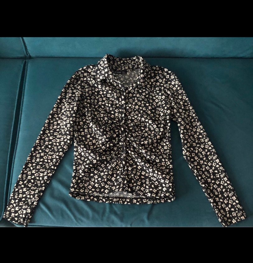 Düğmeli, uzun kollu, yakalı ve oturan kesime sahip siyah çiçek desenli bluz. Sentetik kumaştan, günlük rahat stil için uygundur.