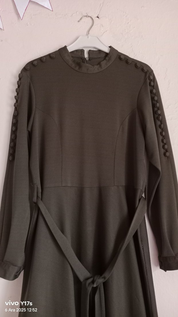 Düğmeli uzun kollu, yüksek yakalı ve gotik tarzda, siyah-gri tonlarında, sentetik kumaştan yapılmış, vücuda oturan uzun elbise.