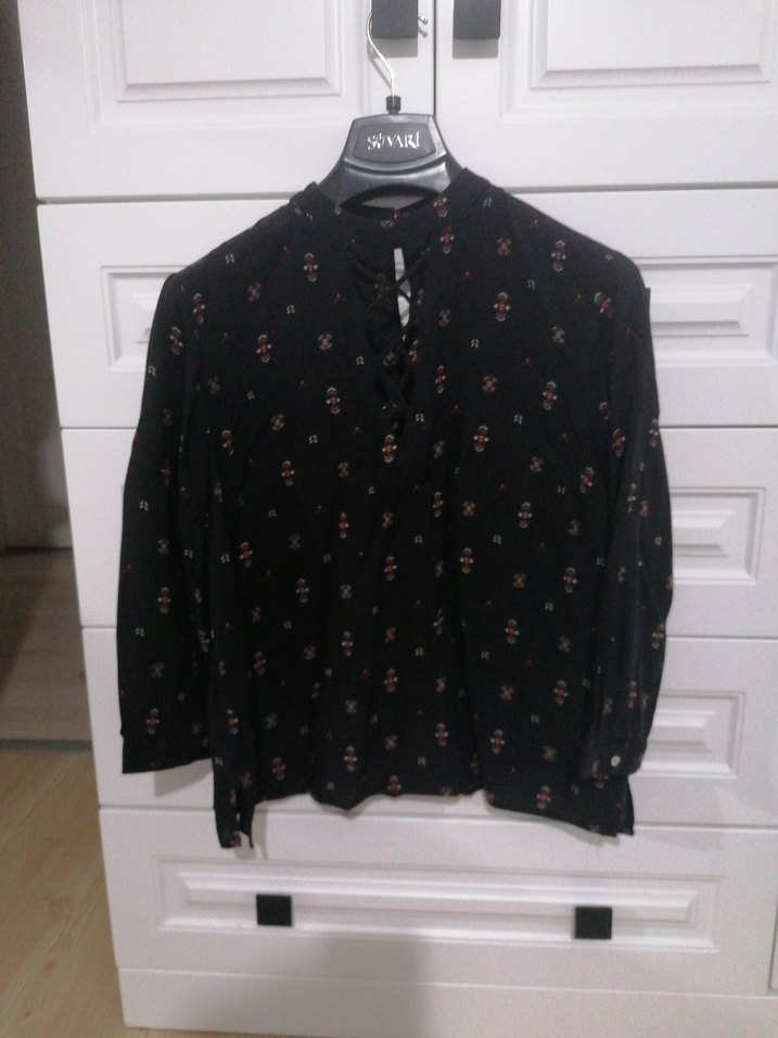 Siyah uzun kollu bluz, yüksek yakalı, düğmeli ve bol kesimdir. Kısa boyda, hafif batik desenlidir ve günlük rahat tarz için uygundur.