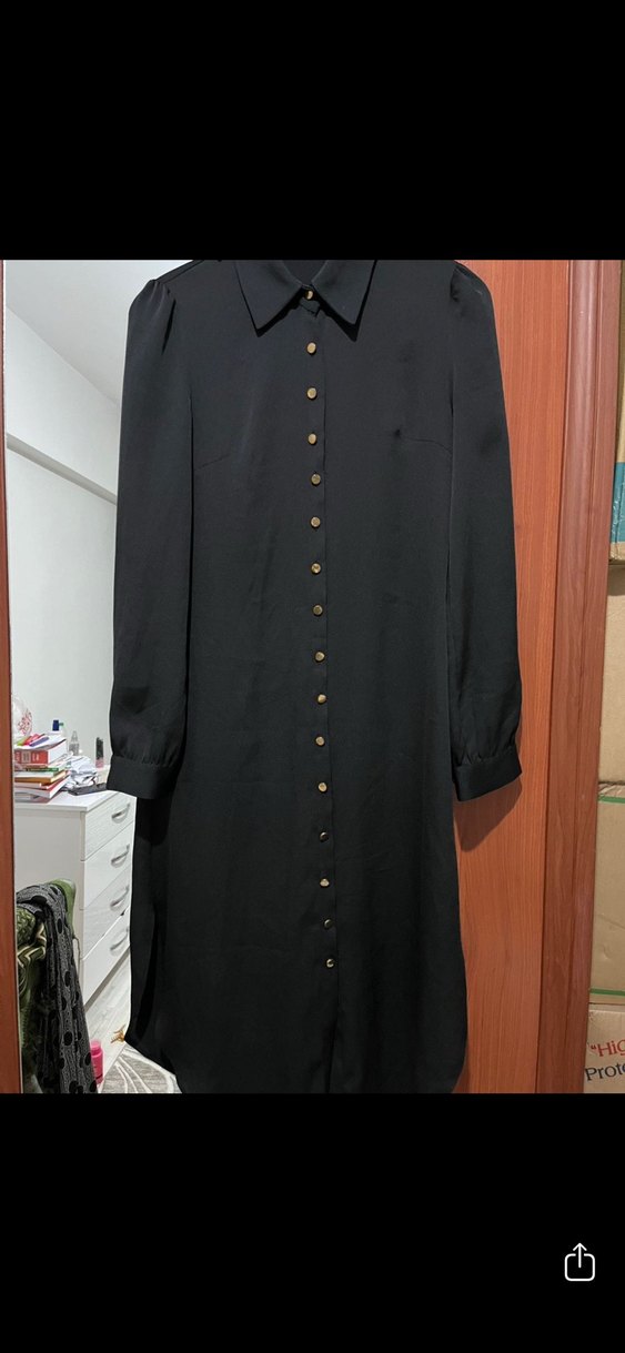 Düğmeli önü ve kesik yakasıyla uzun siyah tunik. Uzun kollu, regular fit ve yumuşak sentetik kumaştan üretilmiştir, ofis için şık ve rahat.