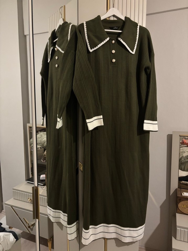 Haki düğmeli uzun triko elbise, yakası işlemeli ve kesik yakalıdır. Triko kumaştan, uzun kollu ve regular fit kesimdedir. Spor günlük elbisedir 1 kez kullanıldı