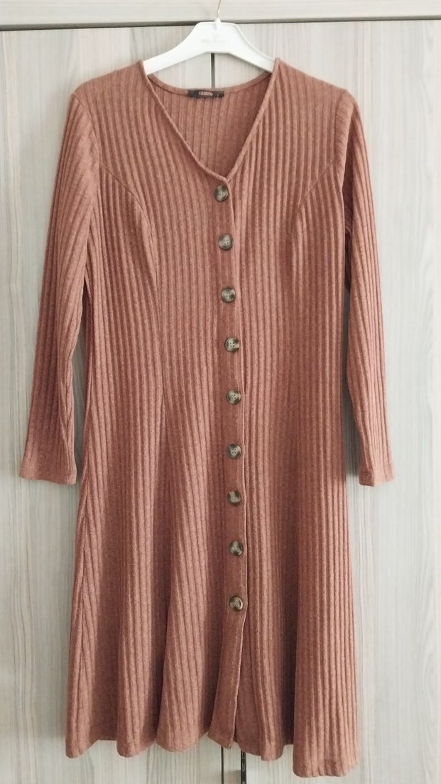 Kahverengi, uzun kollu ve düğmeli ön kısmı olan triko elbisedir. V yakalı, bol kesim ve uzun boyludur, günlük rahat kullanım için uygundur.