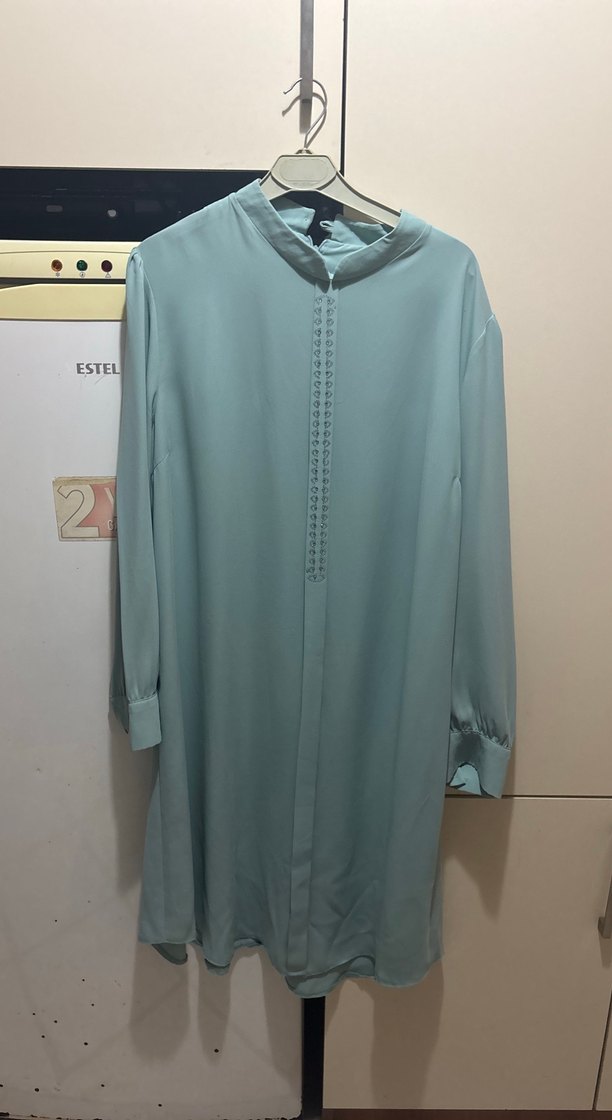 Uzun kollu, yüksek yakalı ve düğmeli önü olan turkuaz renkte, pastel tonlarda, dökümlü ve ipeksi dokulu uzun tunik. Ofis için sade ve minimalist tarzda uygun. ✨