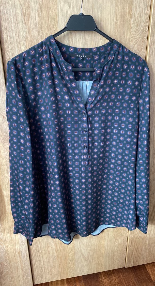 Düğmeli ön kısmı ve V yakası olan, uzun kollu, bol kesim mavi tie-dye desenli kadın gömleği. Tekstil kumaştan, günlük rahat kullanıma uygun. Kol altı. 57 cm Ön 69 cm Arka 74 cm
