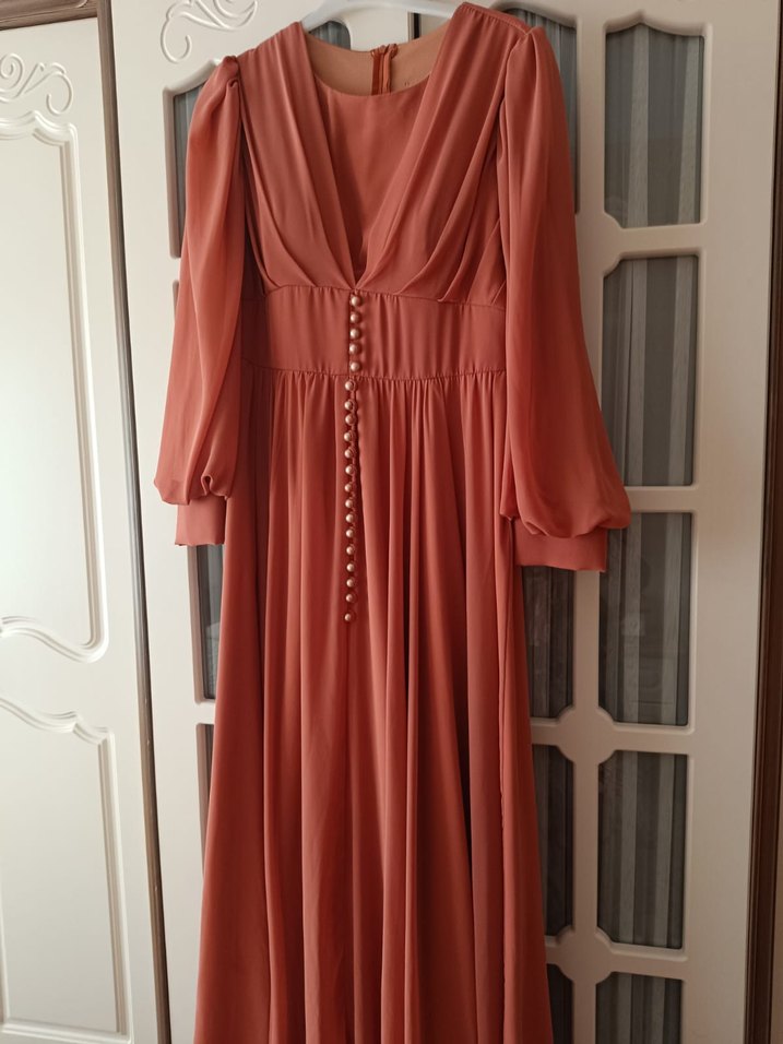 Düğmeli Uzun Kollu V Yaka Uzun Elbise abiye