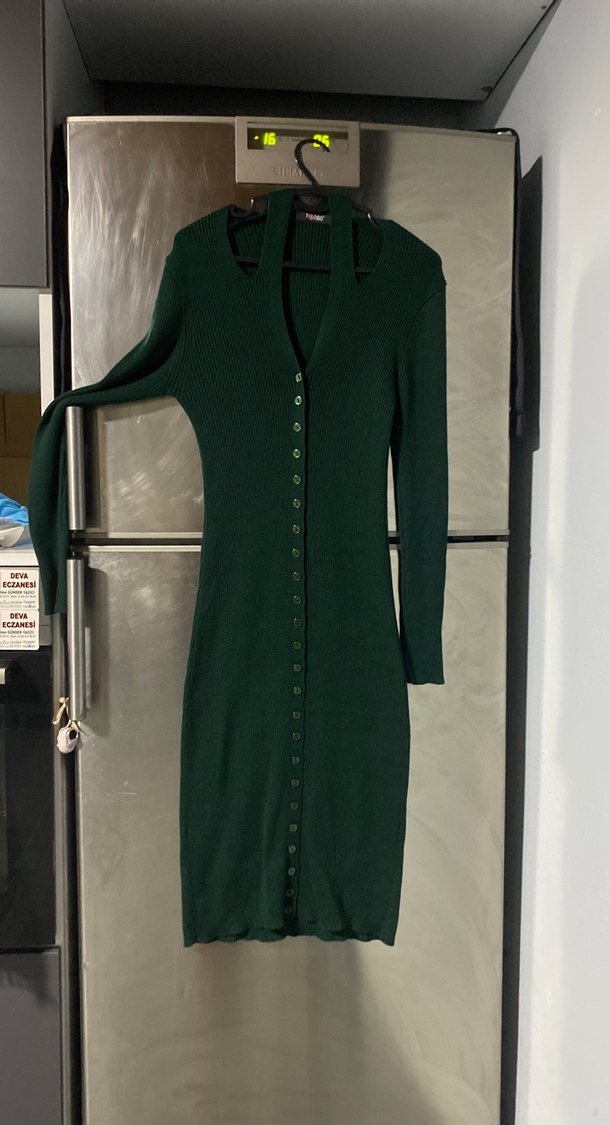 Düğmeli, uzun kollu, yüksek yakalı ve vücuda oturan koyu yeşil uzun elbise. Sentetik kumaştan üretilmiş, gündelik ve iş stiline uygun. Her bedene uyar esnek ve kaliteli kumaştır