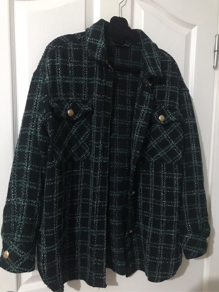 Düğmeli, yaka detaylı, uzun kollu, bol kesim, koyu yeşil gömlek, rahat ve şık sokak stili için uygundur.