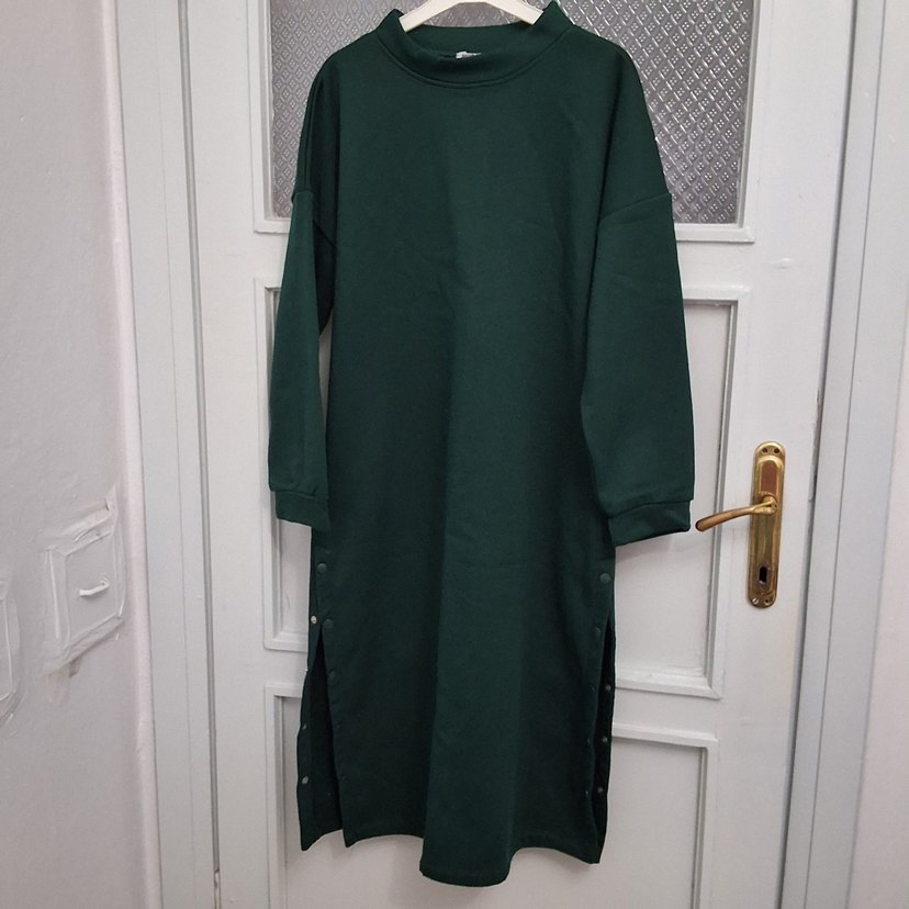 Yüksek yakalı ve bol kesimli uzun yeşil tunik, yanlarda düğme detaylarına sahiptir. Uzun kollu ve yumuşak, sıcak kumaştan üretilmiştir.