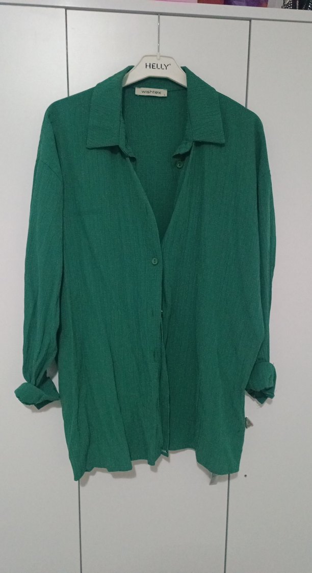 Düğmeli, uzun kollu, keten kumaştan yapılmış, minimalist bohem tarzda yeşil renkli bol kesim gömlek.