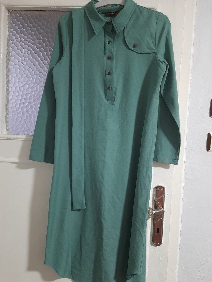 Uzun boy, düğmeli ön ve yakalı yeşil tunik. Uzun kollu, regular fit ve yumuşak sentetik kumaştan günlük rahat kullanım için uygun.