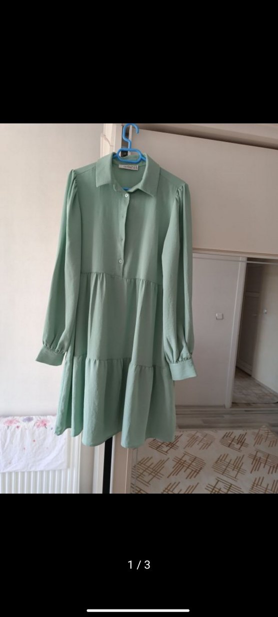 Düğmeli ön ve yakalı uzun kollu, bol kesim yeşil tunik. Yumuşak sentetik kumaştan, günlük sokak stili için uygun.
