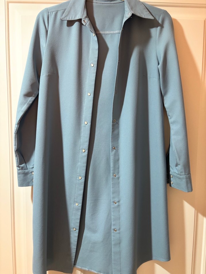 Düğmeli, uzun kesim kot ceketi, notalı yaka ve uzun kollu. Rahat kesimli, gri-mavi tonlarda, ofis için uygun.