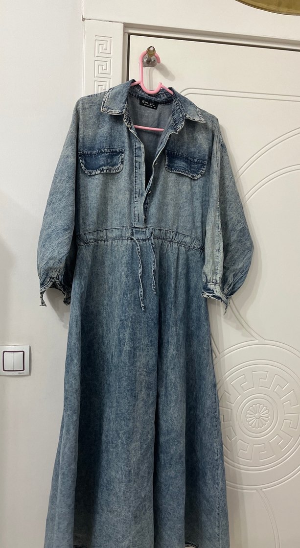 Düğmeli, uzun kollu ve geniş kesim kot elbise. Çift göğüs cebi ve notalı yakasıyla günlük kullanıma uygun rahat bir sokak stili sunar.