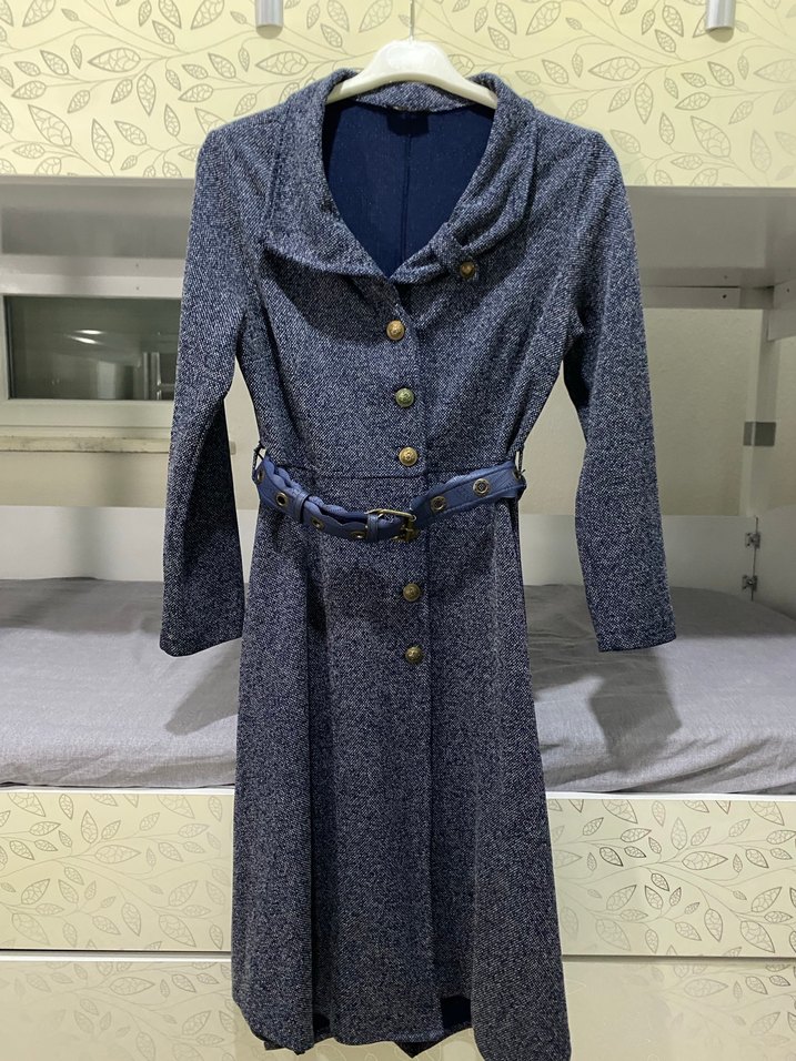 Düğmeli, uzun lacivert kadın ceket, örme kumaştan üretilmiş, normal kesim ve uzun kolludur. kemeri çıkarılarakta kullanılabilir. estetik düğmeleri ile günlük kullanıma uygundur.