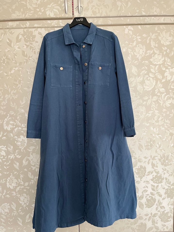 Düğmeli ve uzun kollu, bol kesim lacivert denim kadın kaban. Notlu yaka ve günlük kullanıma uygun rahat sokak stili.