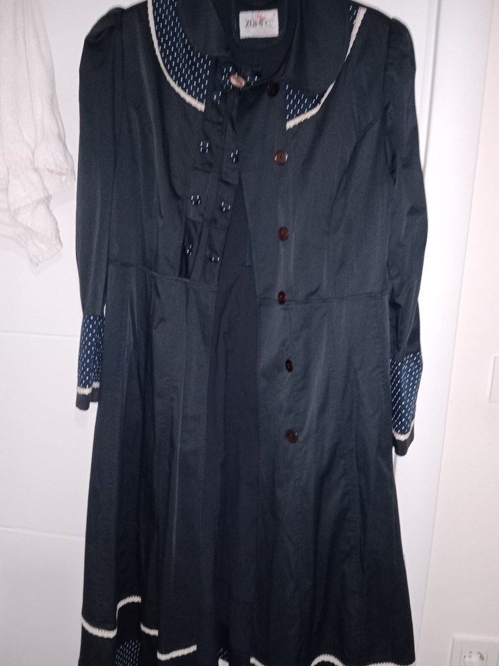 Düğmeli uzun lacivert kadın kaban, bol kesim ve tekstil malzemeden. Notch yaka ve uzun kollu vintage goth tarzında, ofis kullanımı için uygun.