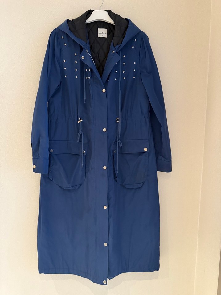 Düğmeli, uzun kesim lacivert kadın yağmurluğu, notched lapel yakalı ve bol kesimdir. Sentetik kumaştan, kapüşonlu ve büyük ceplidir. ️42 bedene kadar uyumlu mood basic markadır koltuk altında ufak sökük var