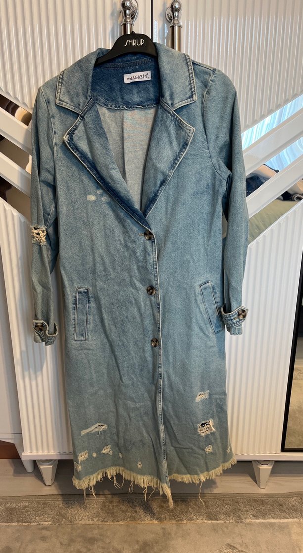 Düğmeli, uzun mavi denim ceket, kesik yaka ve uzun kolludur. Rahat kesimi, yıpranmış detayları ve püsküllü etek ucu ile sokak stili için uygundur.