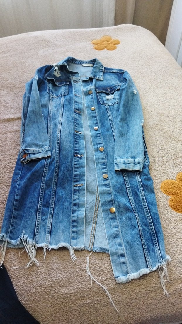 Düğmeli, uzun kesim mavi denim ceket, bol kalıp ve kesik yakaya sahip. Uzun kollu, günlük rahat sokak stili için uygun.