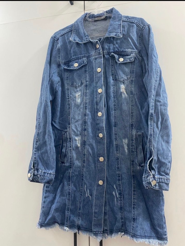 Düğmeli Uzun Mavi Denim Ceket